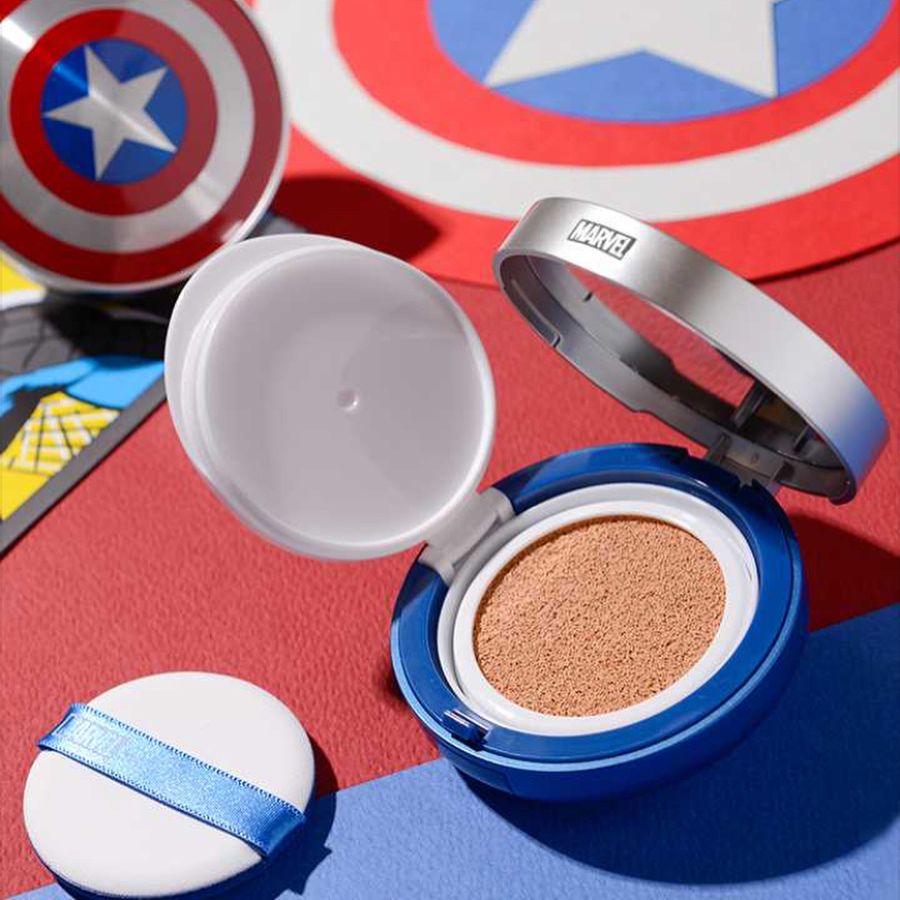 - Anti-Darkening Cushion: Promete ótima cobertura escondendo imperfeições, com proteção solar de SPF 50. Tem um design do escudo do Capitão América.