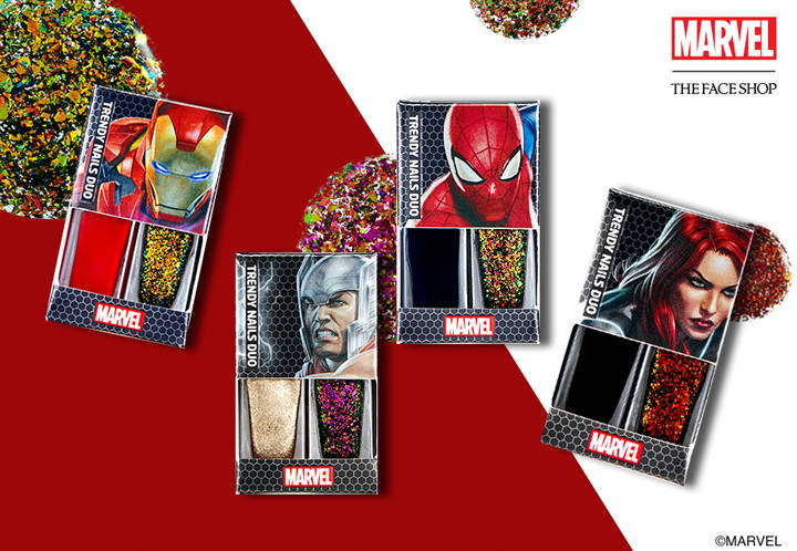 - Trendy Nails Duo: A linha Face Shop X Marvel Comics também oferece quatro duos de esmaltes, cada duo representando um personagem da Marvel contendo uma cor de esmalte e um esmalte em glitter.