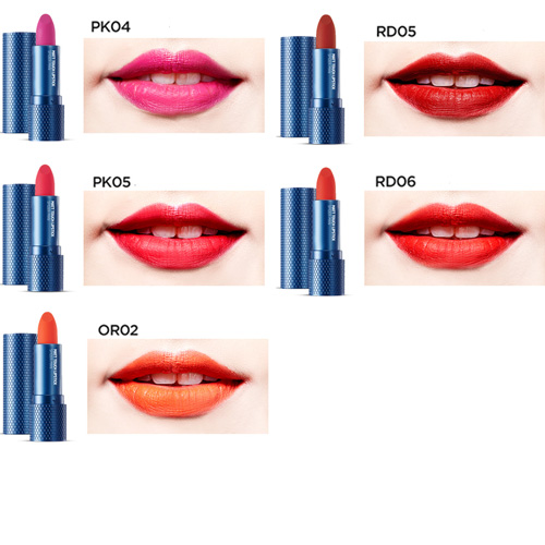 - Matt Touch Lipsticks: Batons com acabamento Matte com cinco cores para escolher, com embalagem azul inspiradas no homem aranha.