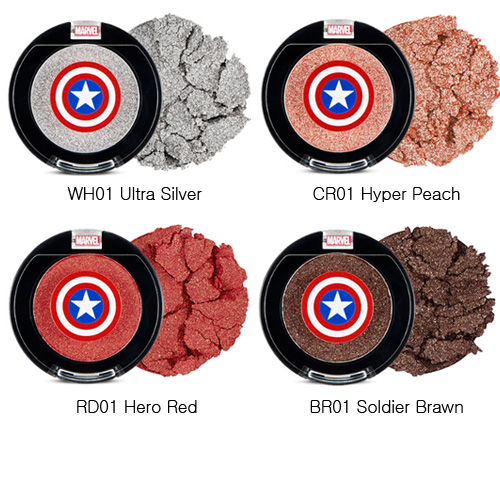 - Sombras Individuais: Além das paletas a linha Face Shop X Marvel Comics lançou quatro cores metálicas de sombra também com embalagem do Capitão América.